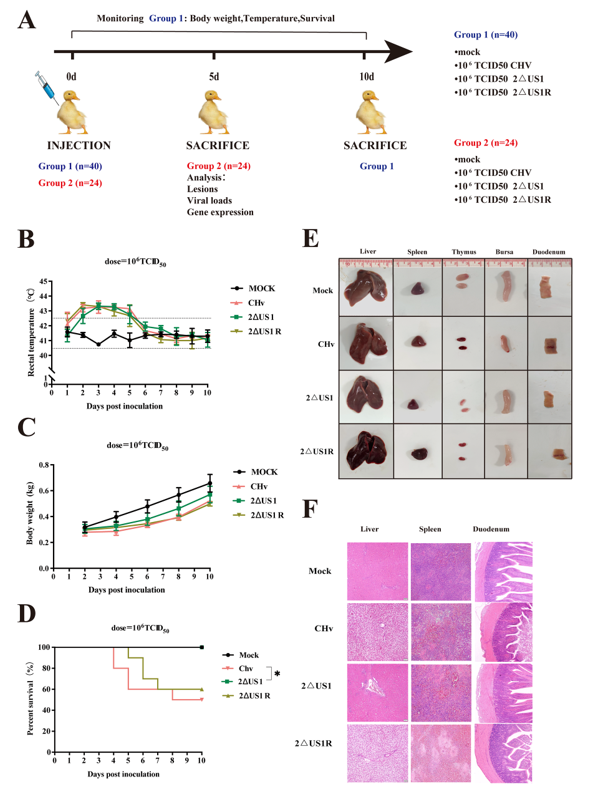 11月15日,德赢VWIN官方网站预防兽医研究所吴英课题组在美国微生物协会旗下知名期刊《Microbiology Spectrum》(中科院二区,IF=9.043)上发表题为“双拷贝US1基因缺失降低重组鸭瘟病毒的体内外感染性”的研究论文,为深入研究鸭瘟病毒的致病机制提供了线索,同时也为预防鸭瘟提供了一种有潜力的候选疫苗。