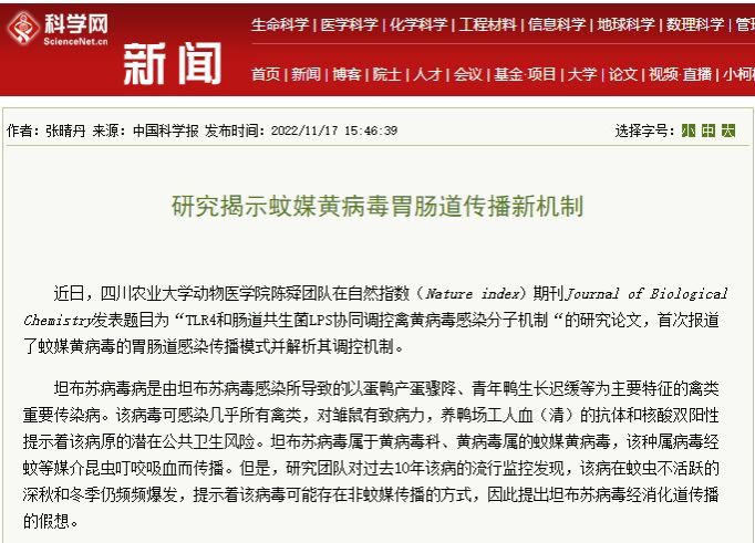 坦布苏病毒病是由坦布苏病毒感染所导致的以蛋鸭产蛋骤降、青年鸭生长迟缓等为主要特征的禽类重要传染病。该病毒可感染几乎所有禽类,对雏鼠有致病力,养鸭场工人血(清)的抗体和核酸双阳性提示着该病原的潜在公共卫生风险。坦布苏病毒属于黄病毒科、黄病毒属的蚊媒黄病毒,该种属病毒经蚊等媒介昆虫叮咬吸血而传播。但是,研究团队对过去10年该病的流行监控发现,该病在蚊虫不活跃的深秋和冬季仍频频爆发,提示着该病毒可能存在非蚊媒传播的方式,因此提出坦布苏病毒经消化道传播的假想。
