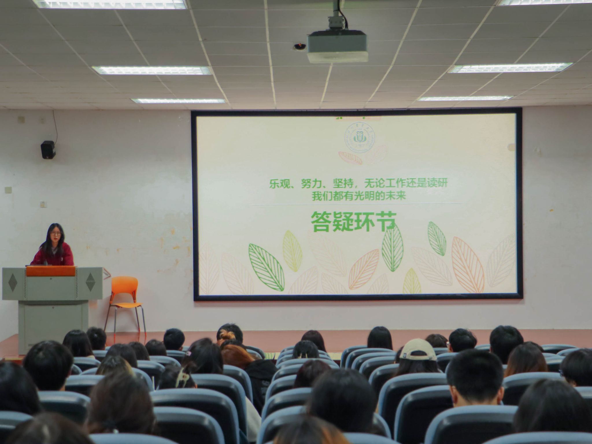 黄俊潘结合自身考研经验从考研择校和作息、考研科目规划和资料获取以及如何调整备考心态三个方面进行了分享,以自身为例向同学们分享备考作息,学习方法和择课经验等,当提到如何调整心态,高效备考时,她鼓励道“乐观,努力,坚持,无论工作还是读研,我们都有光明的未来”。秦誉洋通过分析官方保研文件,假设举例以及讲述自身经历向同学们介绍了推免政策,推免流程以及院校专业选择,他强调无论是考研保研还是就业,信息对称都十分重要,针对推免流程应挂图作战、对表推进。盛雯开场通过一个问题“你了解多少创新创业赛事的内容?”引入宣讲,随后从政策支持,推免加分,奖金补贴、三大赛事简介等方面带来分享,通过对学校官方文件的展示与讲解为在场同学进行了详细的介绍,依据学院大部分学生对于创新创业赛事觉得很遥远、比较陌生的现象,分享了自身的双创经验,为学院同学拨开双创的神秘面纱。宣讲会在一片热烈的掌声中圆满结束。