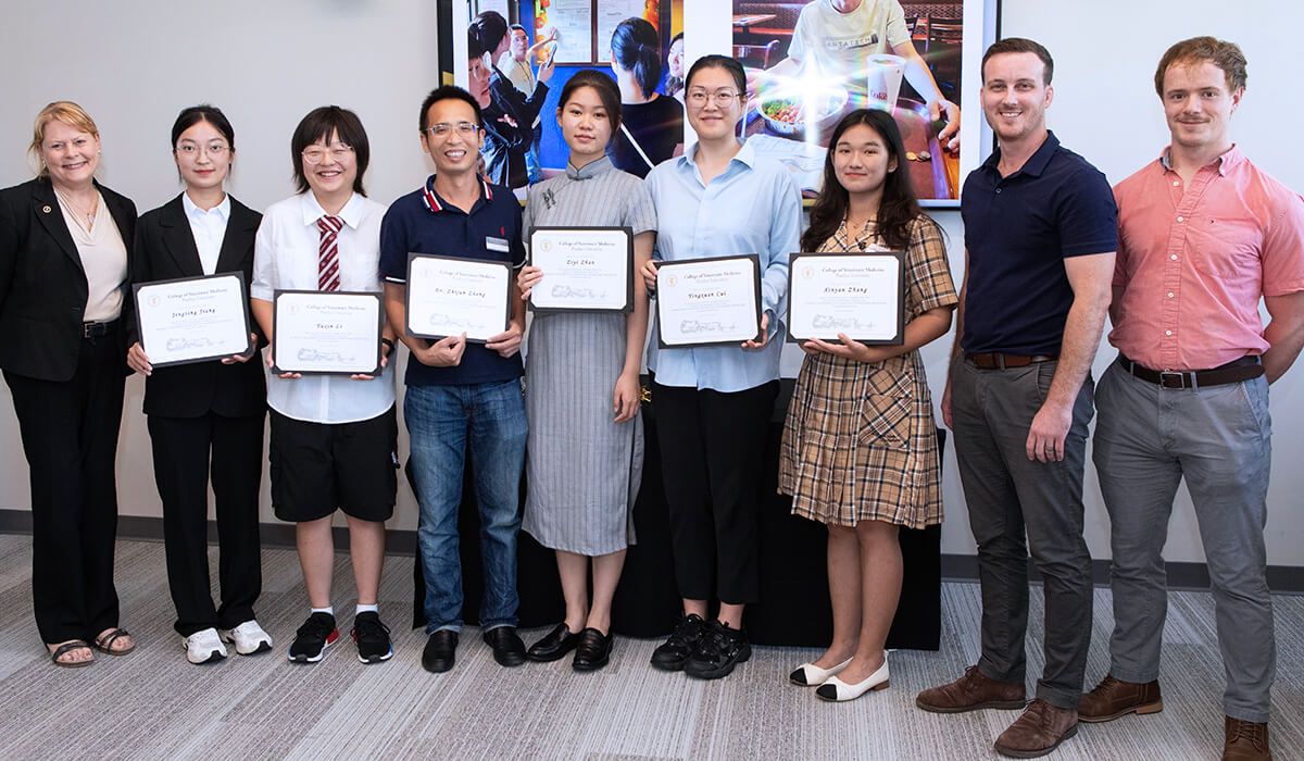 Students from Sichuan Agricultural University (SAU) and their faculty advisor received a warm welcome and a host of clinical learning experiences during a recent two-week visit to the Purdue University College of Veterinary Medicine. The college hosted the visit as part of a long-standing exchange relationship with the SAU College of Veterinary Medicine in Chengdu in China’s Sichuan Province.