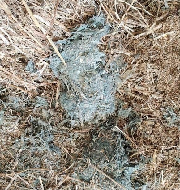 但这不是致肉牛死亡的主因。走进该养殖场配料间,马晓平发现,用于饲喂的稻草已经高度发霉、稻草霉变严重,同时还发现酒糟保存不当导致发霉变质非常严重,另外,在拌料机旁发现一些捆绑稻草的塑料绳索。