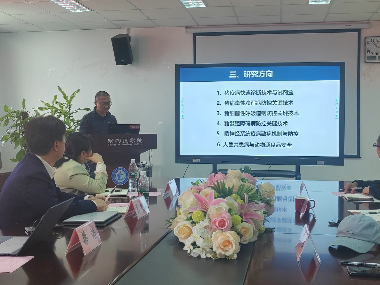 陈舜代表学院对国家生猪技术创新中心一行表示热烈的欢迎,并对学校和学院办学历史、专业设置、学科排名、人才培养、科研平台建设等作了介绍。文翼平老师介绍了猪病研究中心基本情况、团队构成、科学研究、社会服务等。龙科任博士对动物科技学院动物遗传研究中心基本情况进行了介绍。
