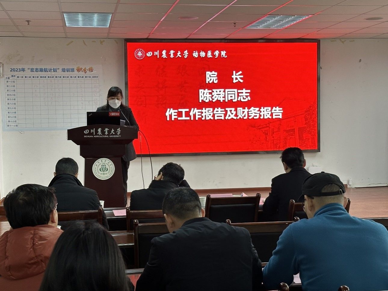 首先,主持人陈正礼教授报告应到、实到人数,并宣布大会开幕。随后,学院工会副主席叶刚副教授做工会工作报告和经费收支情况报告。他详细介绍了工会全年经费的具体使用情况,以及工会面向全体会员开展的“光彩绽放,梦圆动医”新年晚会等13场主题活动,这些活动不仅增进了教职工之间的交流和感情,也为学院的文化建设和发展做出了积极贡献。