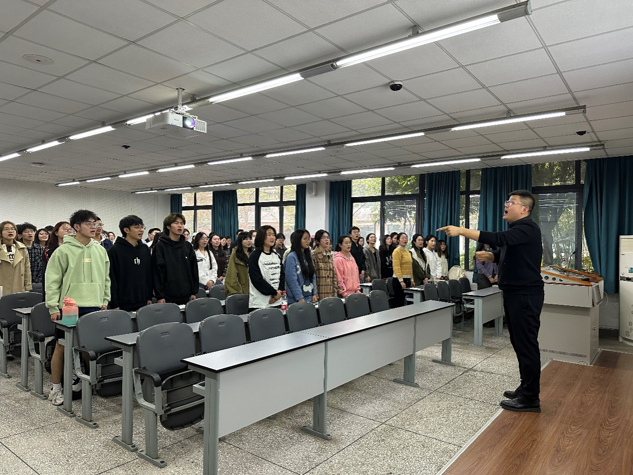 课程最后,全体师生通过合唱、齐唱、轮唱等多种形式,共同排练了《没有共产党就没有新中国》,各声部配合默契。这种团队排练的方式不仅增强了同学们的凝聚力,也让他们更加深刻地理解了红色歌曲所蕴含的时代内涵与精神。