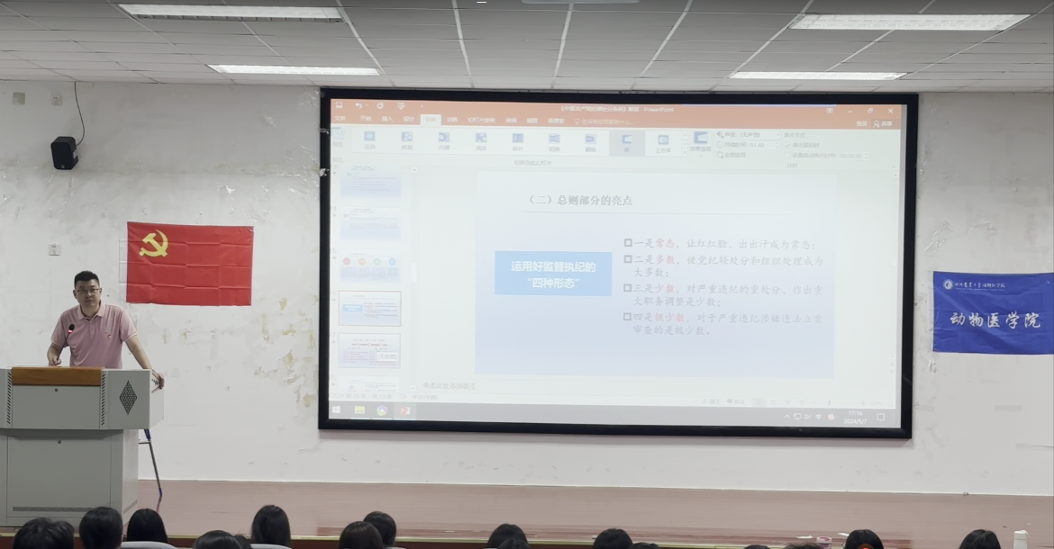 5月7日下午,由学校学生处主办的“辅导员公开课第七季——学生党支部书记讲党纪”宣讲活动在4A102教室开展。本次活动由德赢VWIN官方网站辅导员马保欣老师担任主讲,他采用广播剧这一创新形式,生动解读了《中国共产党纪律处分条例》第一编总则,吸引了学院140余名学生党员参与。
