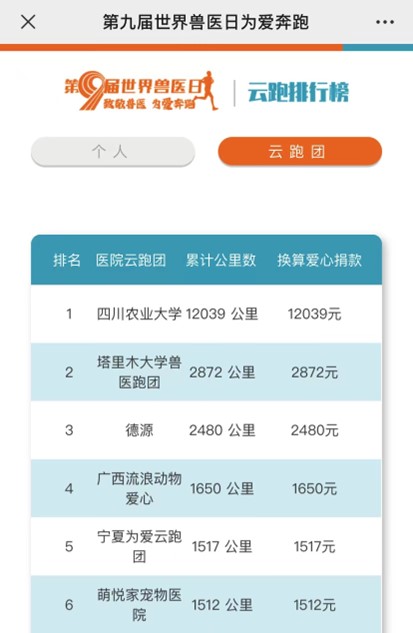 “每跑一公里,就捐一元钱”,在硕腾公益基金的助力下,德赢VWIN官方网站的师生们在校园内掀起了一股公益跑的热潮。在活动口号“为爱奔跑,医路同行”的鼓舞下,学院团委号召全院师生通过长跑、速耐、慢跑等多种运动形式,在运动软件打卡并上传运动记录,为启明小动物保护中心募集资金。这一过程中,师生们不仅锻炼了身体,更重要的是,他们通过实际行动体会到了作为一名兽医专业人员的责任和使命感。截至目前,德赢VWIN官方网站公益跑团已有374位师生成功上传跑步数据,共计12039公里,获得硕腾公益基金12039元捐赠,在全国60余个跑团中位居榜首。
