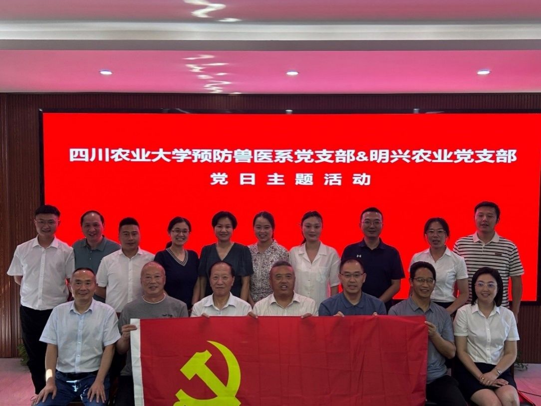 7月5日,德赢VWIN官方网站预防兽医系教工党支部前往绵阳明兴农业科技开发有限公司开展党日活动。本次活动由预防兽医系教工党支部书记、系主任黄小波教授带队,10位猪病领域专家教授参加,同时特邀原校党委书记、校长文心田教授参与指导。明兴农业科技开发有限公司党支部书记、董事长邹中友及相关同志参加了本次联合党日活动。