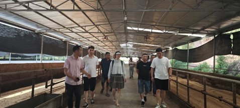 专家们顶着烈日,在富顺县农业服务中心工作人员陪同下走访了童寺镇东禅村腾牛农业科技有限公司等肉牛养殖基地。工作人员介绍了饲料来源、饲养管理方法及牛场粪污处理等情况。专家们了解到近期极端高温天气给牛群带来热应激综合征,出现食欲减少、消化功能减退、料肉比下降,并发呼吸道综合征等疾患。对此,王娅建议在牛场加大通风力度、添加遮阳网,使用喷淋降温系统避暑,适当调整喂料时间以提高牛群食欲,在饮水中添加电解多维等抗应激饮水剂,增加清理粪污频率以避免粪污贮留牛圈。