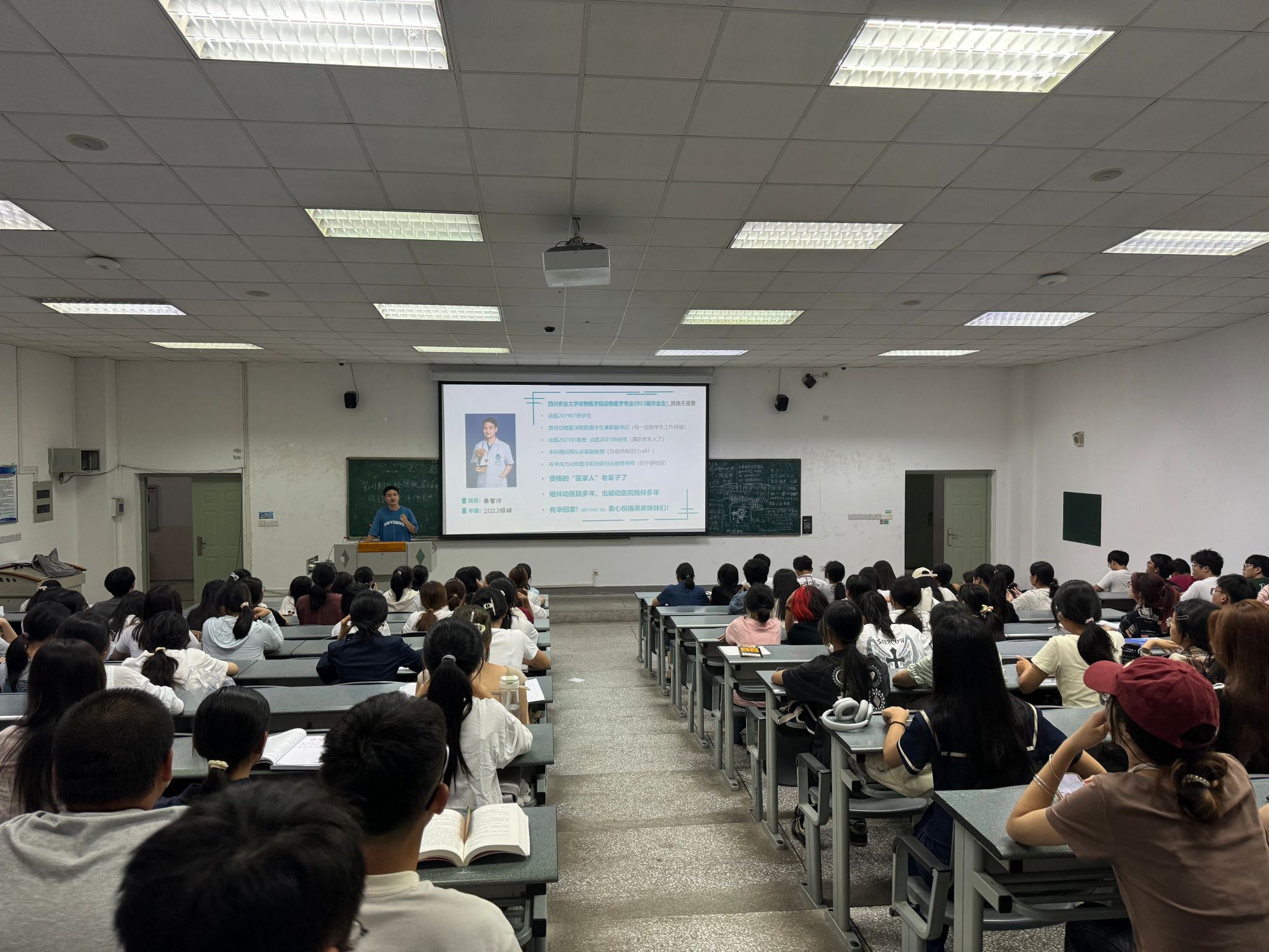 为了激发新生们的创新创业意识,学院特别邀请了动医创客朋辈导师、优秀学生标兵获得者秦誉洋师兄返校,为同学们带来了创新创业专题培训。在培训中,秦誉洋深度剖析双创赛事的发展,还结合学院专业特色,通过分析历届成功的双创项目案例,为新生们讲解了双创比赛的具体要求和参赛技巧,他特别强调了如何将专业知识与创新思维相结合,并通过不断的探索和尝试,转化为切实可行的双创项目。培训结束后,同学们与秦誉洋师兄进行了互动交流,提出了自己在创新创业方面的疑问和想法。师兄耐心地一一解答,并给予了建设性的建议。这种互动不仅增强了新生们的参与感,也进一步激发了他们对创新创业的热情。