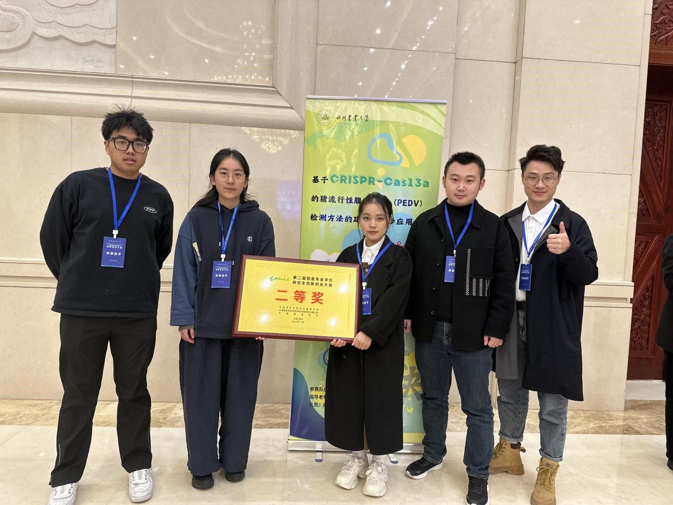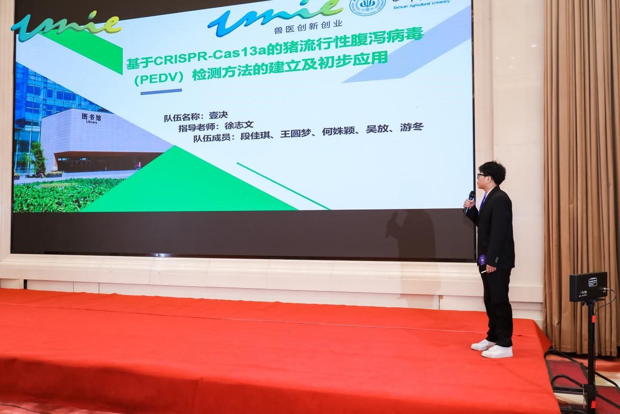在激烈的竞争中,由德赢VWIN官方网站徐志文教授指导,段佳琪、王圆梦、游冬、吴放、何姝颖等5位硕士研究生组成的“壹决”团队,以《基于CRISPR-Cas13a的猪流行性腹泻病毒(PEDV)检测方法的建立及初步应用》为主题,聚焦猪流行性腹泻病毒检测方法的创新和实际应用情况展开阐述,经项目汇报答辩及专业素养展示,凭借其出色的表现和创新项目,荣获创新组二等奖。这一成绩不仅展现了我校德赢VWIN官方网站研究生的创新能力和专业素养,也是我校在兽医教育和科研领域实力的体现。