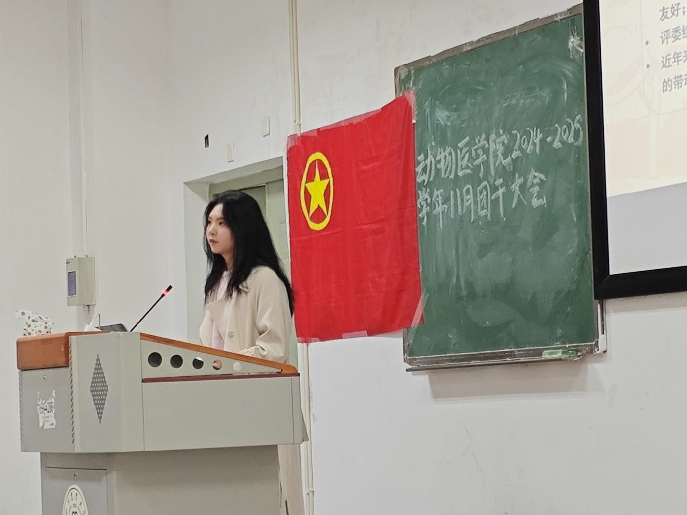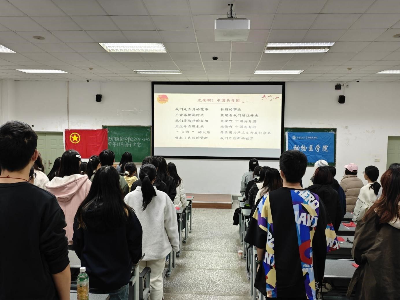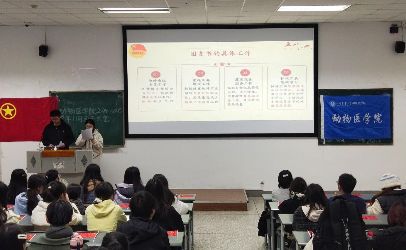 大会伊始,全体参会人员齐唱团歌,激昂的旋律彰显了团员青年的蓬勃朝气与使命感。会议围绕多项重要议程展开。主持人程代磊、陈佳媛详细讲解了团干职责。团支书、班长、组织委员、宣传委员等应各司其职,共同推动团支部工作的顺利开展。在团内事务时刻表与班团活动规则讲解环节,大会明确了 各团支部2024 秋 - 2025 春各阶段的工作重点。同时,对班团活动新规进行了深入解读,确保班团活动有序开展。同时大会对支部手册填写的规范性以及智慧团建系统中教育实践录入的操作方法及注意事项进行了细致说明,保证基础团务工作顺利进行。