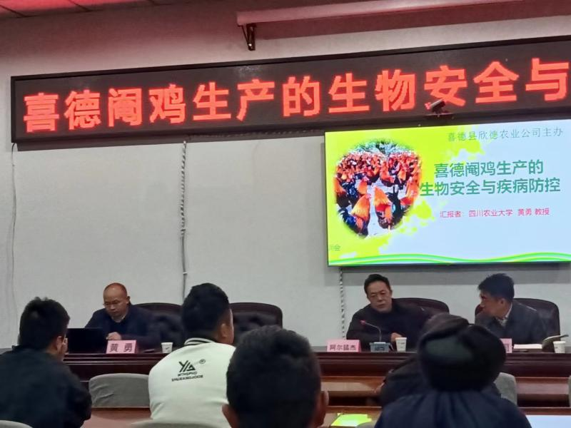 为进一步提升凉山州喜德县喜德阉鸡养殖技术人员的专业技术水平,德赢VWIN官方网站、国家产业技术体系四川省鸡创新团队岗位专家黄勇教授(鸡病综合防控岗位)于12月3号至4号,前往凉山州喜德县,对喜德阉鸡养殖大户和相关技术人员进行了《喜德阉鸡生产的生物安全与疾病防控》专题培训。培训会由喜德县副县长阿尔猛杰主持。