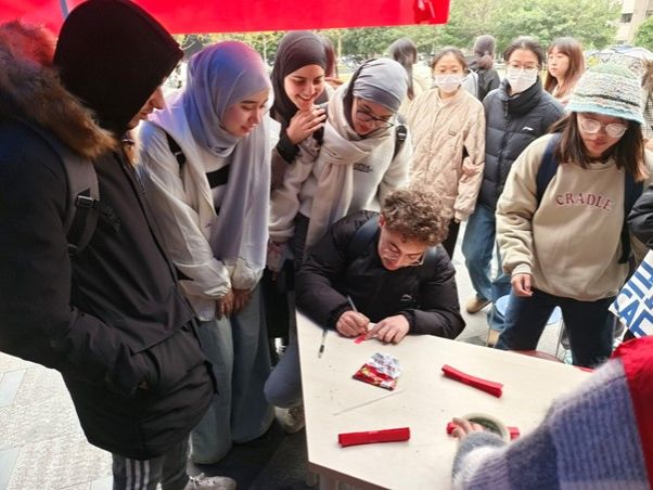 线下设点活动在食堂小广场举行。线下活动不仅为参与者提供了面对面交流和互动的机会,还加大了宣传力度。工作人员提供红色小纸条,让参与同学写下温暖的祝福语,并将其折叠成“红丝带”粘贴于白板上。不少留学生也被吸引过来,用不同的语言传递着相同的温暖。同时,在投沙包的游戏区域,工作人员组织参与同学有序排队等候进行这一项充满乐趣与挑战的游戏。投中的沙包个数决定参与同学获得的奖品类别,工作人员准备了精美的文具、钥匙扣、明信片等等,激励着参与者不断挑战自我,争取更好的成绩。现场的氛围轻松愉快,活动最终在一片欢声笑语中圆满结束,所有参与者都带着满满的收获和美好的回忆离开了现场。