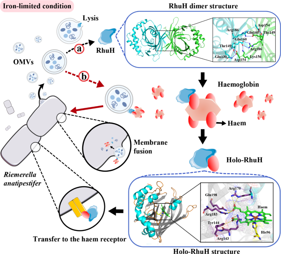 近日,由国家农业(水禽)产业技术体系岗位科学家、德赢VWIN官方网站程安春/刘马峰教授团队和福建师范大学欧阳松应教授团队合作在中科院一区Top期刊Advanced Science上发表题为“Structural Basis and Mechanism of a Unique Haemophore in the Haem-iron Acquisition by Riemerella anatipestifer(一种新型血红素载体蛋白参与鸭疫里默氏杆菌血红素摄取的结构基础及作用机制)”的研究论文。该研究以鸭疫里默氏杆菌为代表,在黄杆菌目中鉴定了一种新型的血红素载体蛋白RhuH,并解析了其独特的结构特征和作用机制,为深入理解黄杆菌目细菌对血红素的摄取机制提供了新的见解。