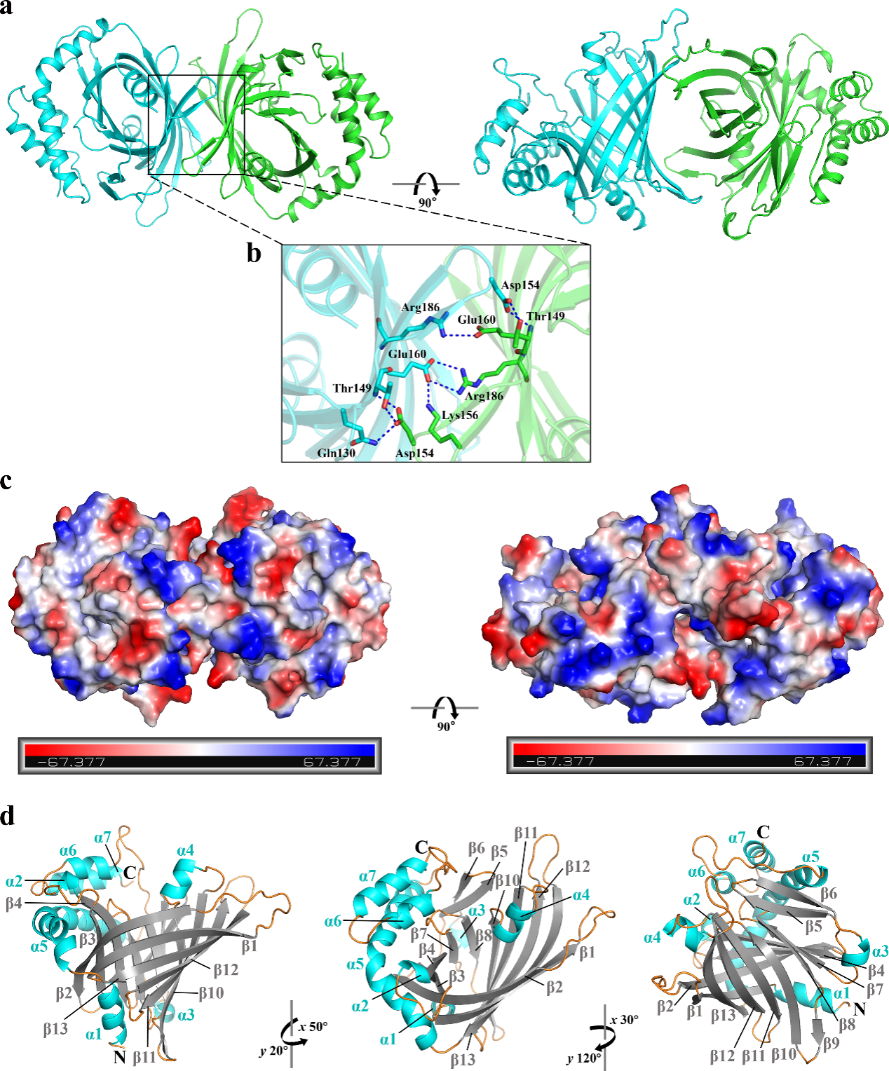 (a)RhuH二聚体结构;(b)RhuH二聚体界面相互作用的放大视图;(c)RhuH 蛋白的表面电荷。蓝色表示正电荷,红色表示负电荷。(d)不同角度展示RhuH单体结构。