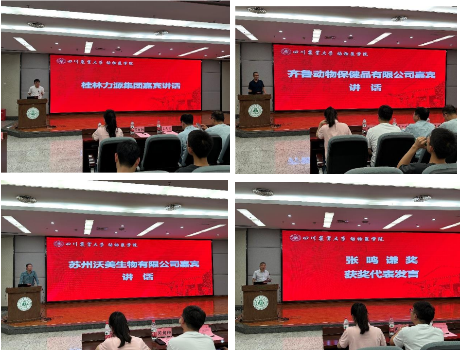 各企业代表也纷纷发言,表达对学院学子的关怀。川农校友、桂林力源集团企业代表闫朝阳先生向现场观众介绍了企业背景,强调力源集团始终以实际行动为消费者提供安全健康的食品,为农牧行业发展添砖加瓦,并期待更多有志之士加入。齐鲁动物保健品有限公司川渝省区经理赵书生先生介绍了企业发展情况,为学子们送上真挚寄语,鼓励他们在专业道路上不断探索。苏州沃美生物有限公司CRO事业部总经理方鹏飞先生对动医学子表达了深切祝福,并欢迎大家加入沃美。