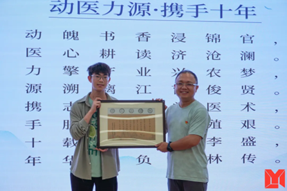 活动最后,力源读书与实践俱乐部现任负责人杨嘉明代表全体成员,向力源集团赠送了由同学们精心创作的“动医力源·携手十年”藏头诗书法作品。这份特殊的礼物,不仅凝结着学子们的感恩之心,更寄托着对下一个十年的美好期许。