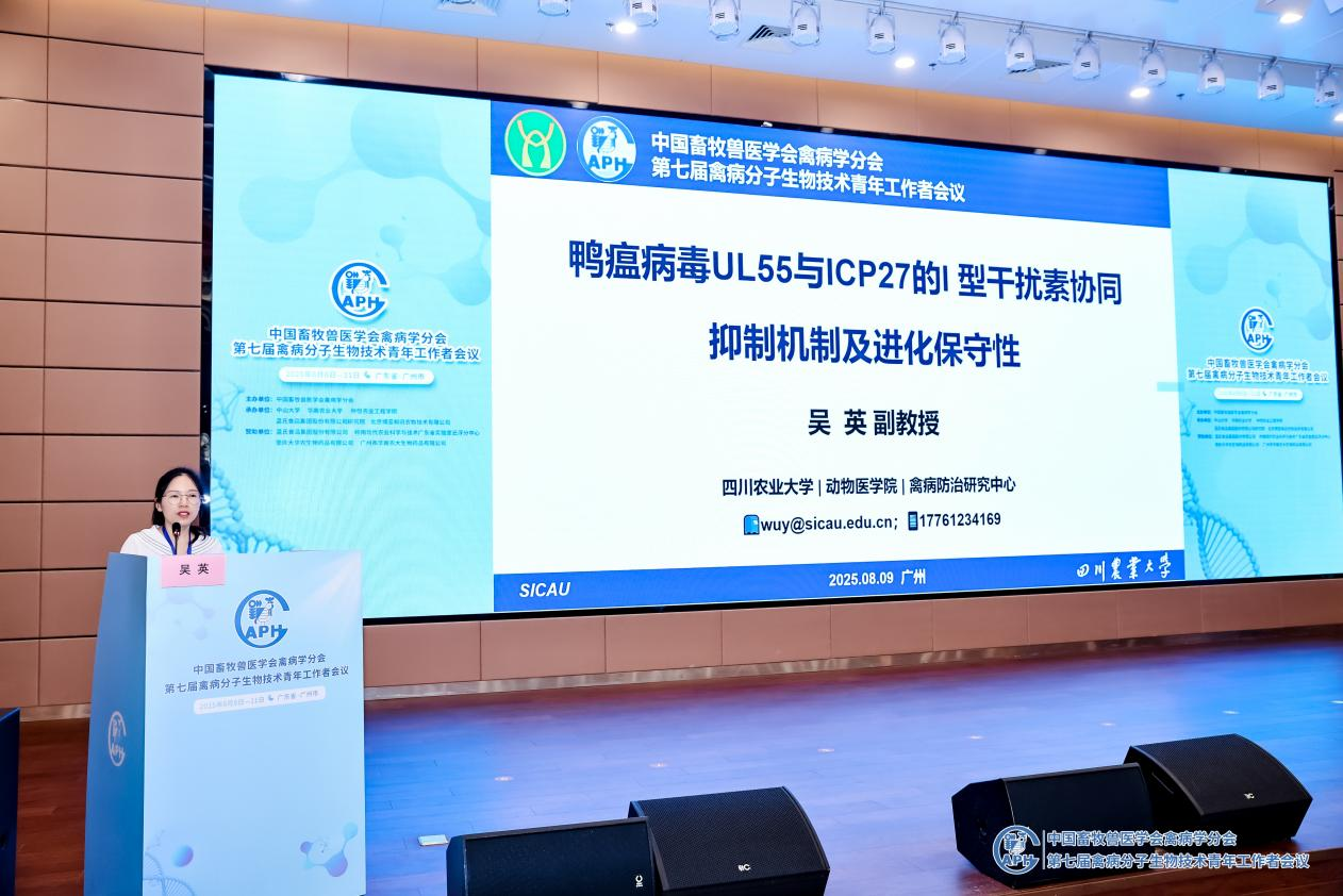 吴英副教授作了题为“鸭瘟病毒新型免疫抑制因子UL55与ICP27的干扰素协同抑制机制及进化保守性研究”的青年学者报告,汇报了课题组在鸭瘟病毒免疫逃逸机制上的新发现:UL55与ICP27如何协同抑制I型干扰素通路,以及其抑制机制在疱疹病毒中的的保守性。
