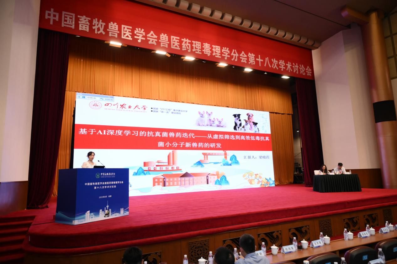 此外,还有18位知名专家学者围绕药理学及其作用机制、毒理学及其作用机制、新兽药创制与应用、细菌耐药性研究、兽药残留及食品安全、AI辅助药物研发等前沿热点领域相继带来高水平报告。其中我校德赢VWIN官方网站梁晓霞教授做了题为《基于AI深度学习的抗真菌兽药迭代——从虚拟筛选到高效低毒抗真菌小分子新兽药的研发》的大会报告,系统介绍了人工智能技术在抗真菌新兽药研发中的创新应用,重点阐释了如何通过深度学习算法实现高效虚拟筛选,从而加速低毒小分子药物的开发进程,受到与会专家的广泛关注和热烈讨论。