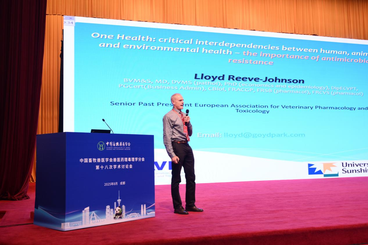 本次会议特邀报告环节汇聚了国内外兽医药理毒理学领域的顶尖专家,阵容强大、议题前沿。中国工程院院士、中国农业大学沈建忠教授深入剖析了“抗菌药物创制及发展趋势”,为行业指明了创新方向。欧洲兽医药理与毒理学学会前任主席Lloyd Reeve-Johnson教授从全球视角阐述了“One Health”理念下抗菌耐药性研究的紧迫性与复杂性,强调了人-动物-环境健康互联互依的重要关系。四川大学王红宁教授聚焦食源性病原菌的整合溯源与精准防控,北京大学裴剑锋教授分享了AI技术助力小分子药物设计成功率的突破性探索,中国兽医药品监察所汪霞研究员系统介绍了化药技术评审工作的进展与思考,格格巫生物科技有限公司首席技术官欧阳晖博士则探讨了创新宠物药研发中的新型毒理研究挑战。
