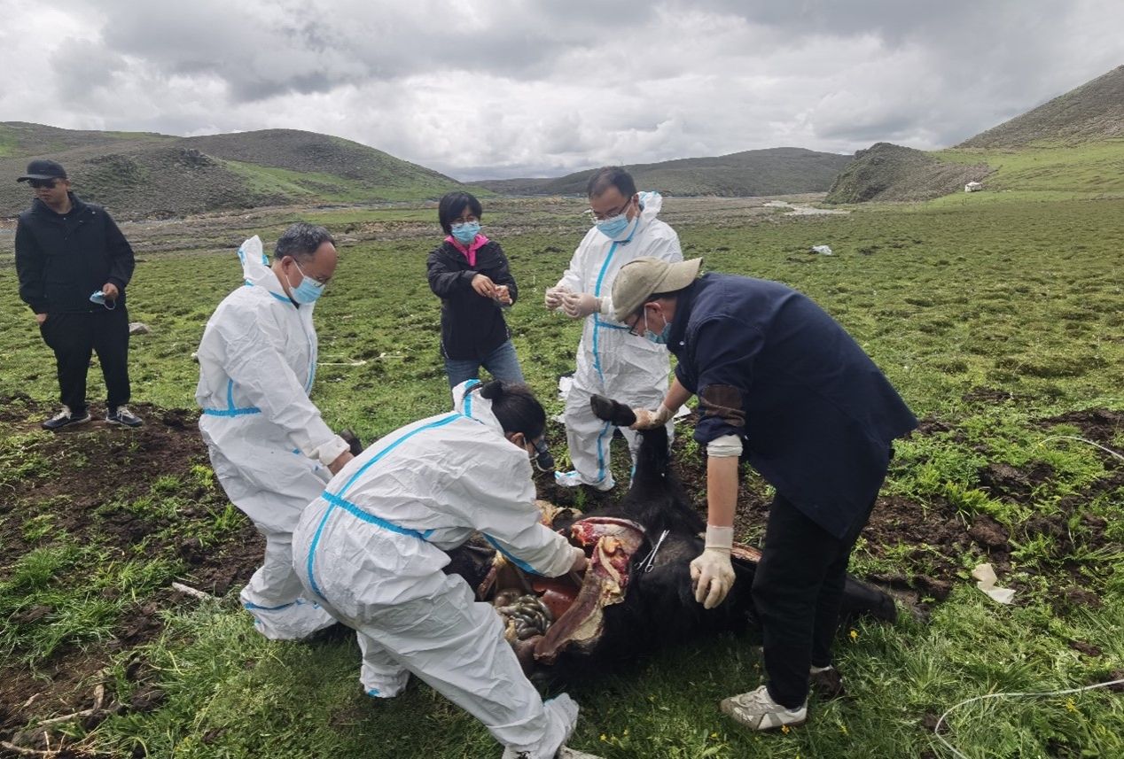 18日上午,在新龙县农牧农村科技局人员的陪同下,德赢VWIN官方网站四位专家又一次前往新龙县友谊乡,对牧户中的一头牦牛突然死亡进行现场病例解剖与疾病诊断。专家团队冒着高反的不适,在牧场下风口进行了为期一个半小时的病死牛只病例解剖。通过解剖发现,该牛只死于肺炎,气管中充满白色泡沫样痰,牛只运动导致急性呼吸衰竭而死亡,专家团队还对发病组织取样带回单位实验室进行病理学分析。随后,针对牧户反馈牦牛群中有部分牛只也出现相同病症,专家团队开具了处方单,并向牧户一一介绍了各药品的使用方法和剂量。