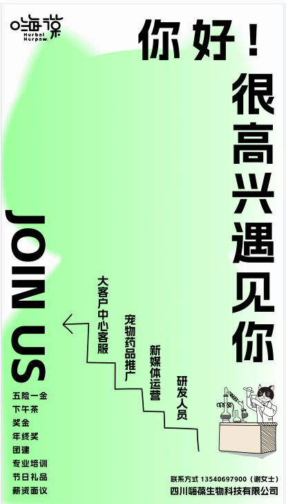 四川嗨葆生物科技有限公司是由一群富有激情创造力的年轻人所创立的集研发、生产和销售三位一体的科创型公司。公司成立于2020年5月,发展至今已拥有妙狸本草、露葆天然和一爪鲜等多个品牌,在售SKU28个,是四川地区最大的宠物中兽医产品供应商之一。嗨葆是一个可以承载梦想的理想地,是一个为想要从事宠物行业的年轻人才华施展的平台,在宠物行业飞速发展,但困难重重的今天,我们期待每一位有理想、有抱负解决当前宠物行业痛点的年轻人加入嗨葆。在嗨葆,你不需要担心经验尚浅,因为我们会有硕博一对一带你了解这个行业,只要你有梦,嗨葆会全力帮助你梦变为马,仗剑天涯!