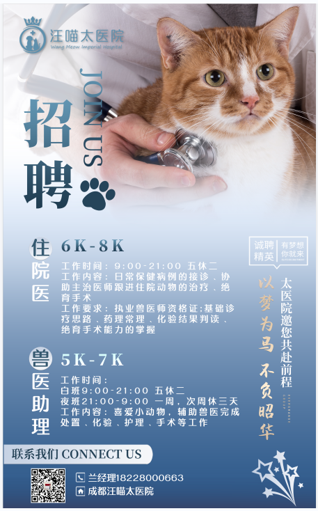成都汪喵太众合医院管理有限公司成立于 2016 年,现已有六家门店,分别位于成都双流区、武侯区、金牛区、锦华区和成华区,其中 5 家门店提供 24 小时诊疗。德赢官网医疗人员100 余名,硕士 6 名,学士 30 余名,其余均为本专业专科院校毕业。
