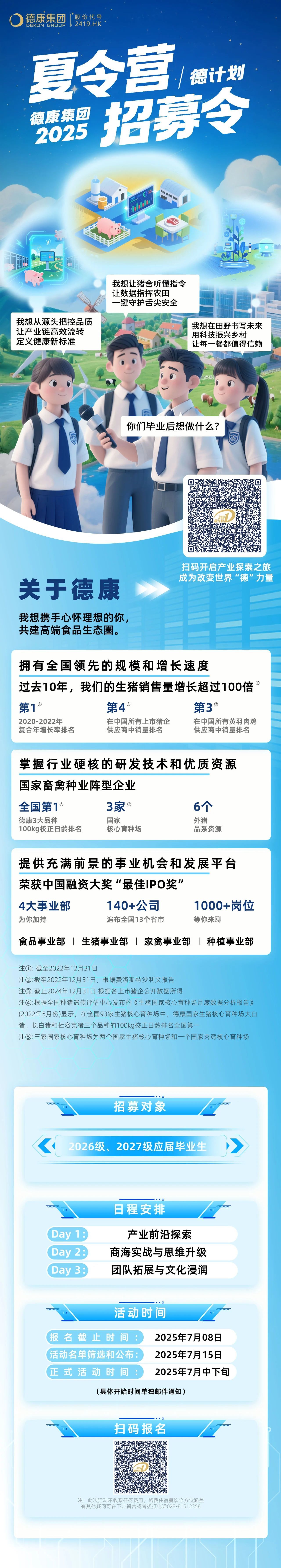 德康集团诚邀各位参加全国独家打造的2025“德计划”夏令营(7月中下旬),开启一场颠覆传统认知的农牧业探索之旅!