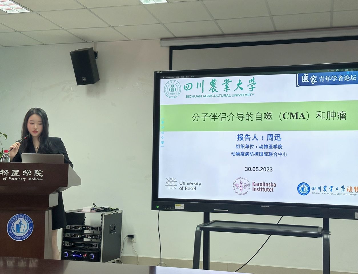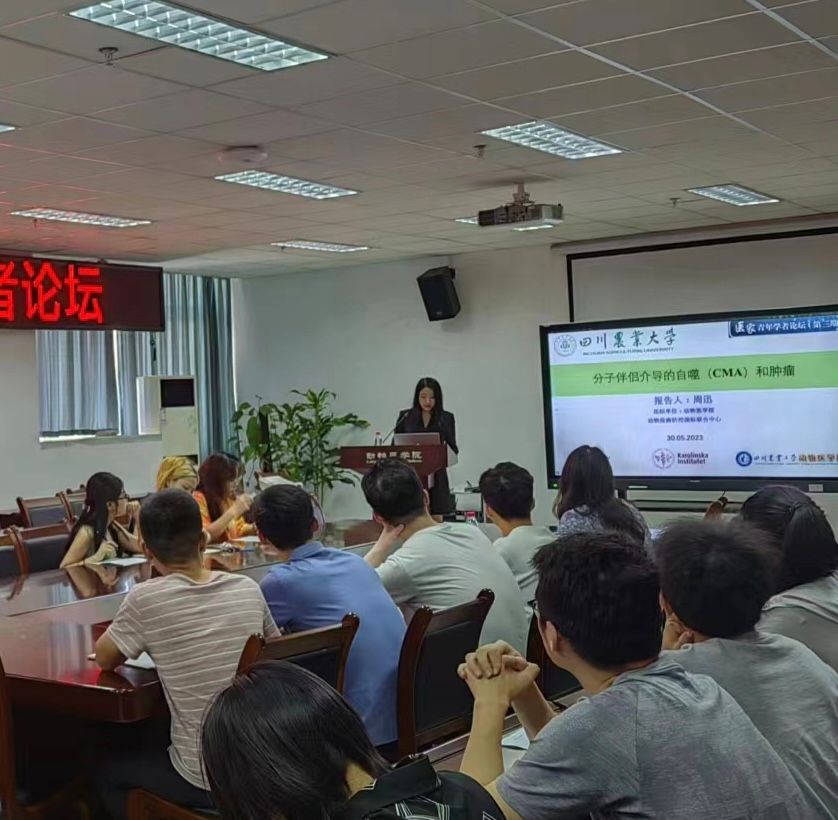 该学术报告内容主要基于周博士在瑞典卡罗琳斯卡医学院进行的博士后研究课题。周博士首先向在场师生介绍了分子伴侣介导的自噬这一新兴的热门研究领域,接着详细讲解了该课题的研究结果,阐明了分子伴侣介导的自噬在肿瘤增殖和转移中的作用机制,向师生们分享了她的研究思路和经验。然后她简单介绍了接下来的研究方向,希望有兴趣的同学加入天然药物化学研究中心,共同探索分子伴侣介导的自噬在动物医学领域的应用。最后主持人药学系主任梁晓霞教授对周博士的科研背景进行了介绍并对报告进行了总结和点评。