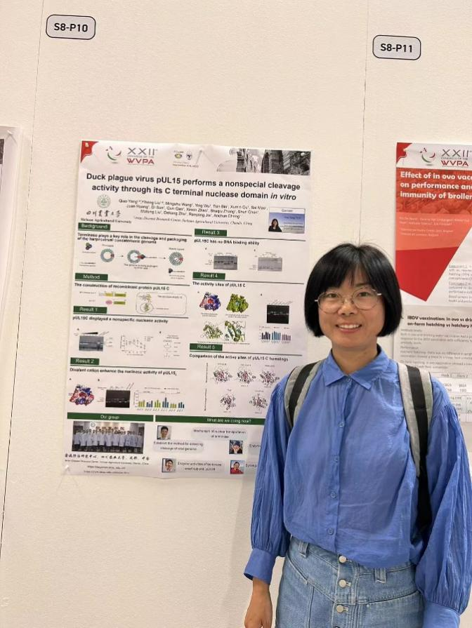 9月4日至8日,2023年世界兽医家禽大会(WVPA)在意大利维罗纳成功举办。来自全球各地的1700余名专家学者齐聚一堂,共同交流和分享家禽养殖方面的研究成果。德赢VWIN官方网站禽病防治研究中心青年教师杨乔博士受邀参会,并展示了名为“Duck plague virus pUL15 performs a nonspecial cleavage activity through its C terminal nuclease domain in vitro”(相关内容已发表在Veterinary Microbiology)的学术海报。