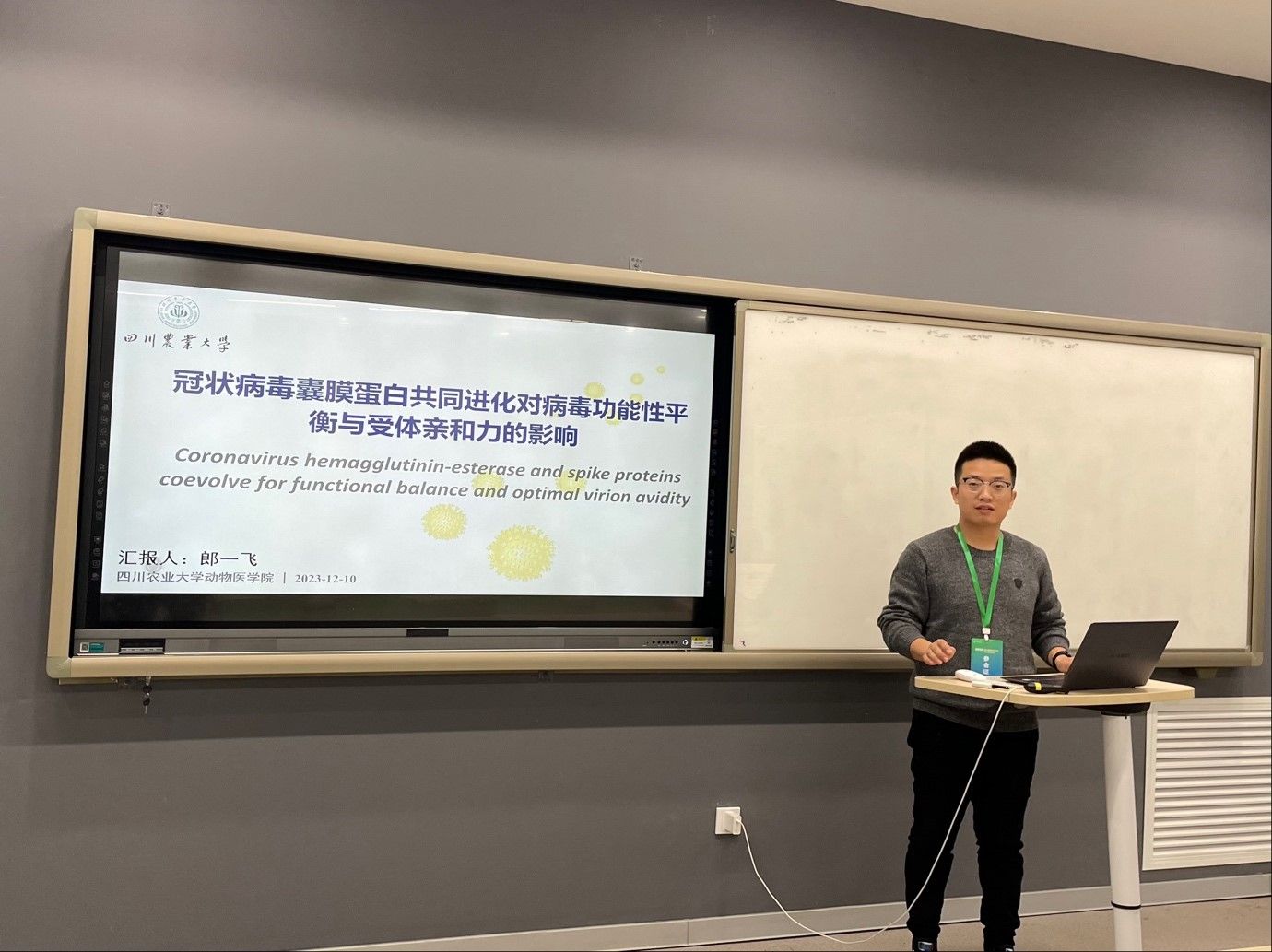 12月10日,第三届“农科博士后学术交流活动”于中国农业大学东校区召开。德赢VWIN官方网站青年教师郎一飞副教授应邀做了“Coronavirus hemagglutinin-esterase and spike proteins coevolve for functional balance and optimal virion avidity(冠状病毒囊膜蛋白共同进化对病毒功能性平衡与受体亲和力的影响)”的主题报告,介绍了其在冠状病毒进化与宿主互作方面的相关研究,获得与会的博士后、青年学者的共鸣与好评。