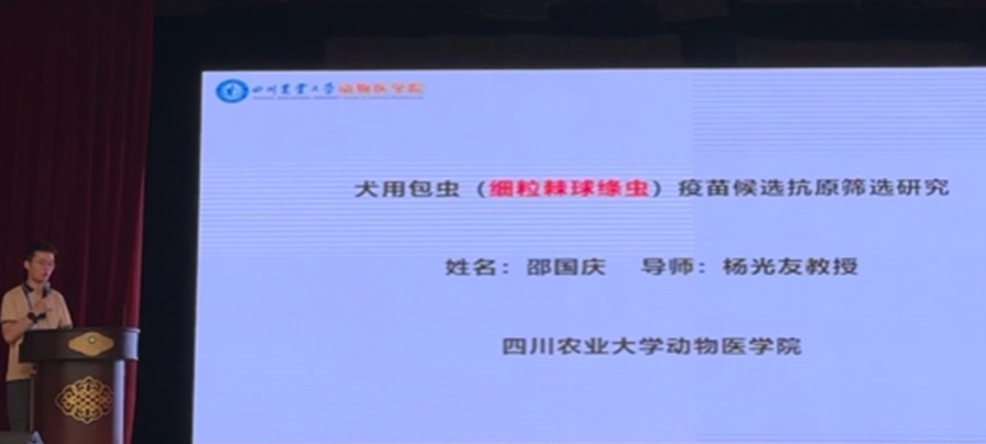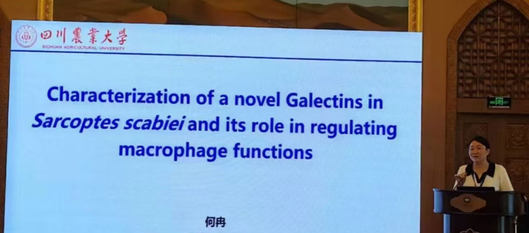 谢跃教授、何冉博士、徐璟博士及博士研究生邵国庆在蠕虫病分会场和外寄生虫病分会场分别发表了题为《Some new findings in roundworm towards better understanding and controlling them》(蛔虫新发现助力更好地了解和控制它们)、《Characterization of a novel galectin in Sarcoptes scabiei and its role in regulating macrophage functions》(疥螨半乳糖凝集素家族对宿主巨噬细胞调控作用的探究)、《疥螨谷胱甘肽S-转移酶delta亚族的免疫保护性研究及作为潜在药物靶点的评价》、《犬用包虫病重组亚单位疫苗候选抗原筛选研究》的学术报告,介绍了动物寄生虫病研究中心在蛔虫病、疥螨病、包虫病等领域的最新科研成果,获得了与会专家的高度评价,何冉老师更是荣获“正典杯”优秀学术报告三等奖。