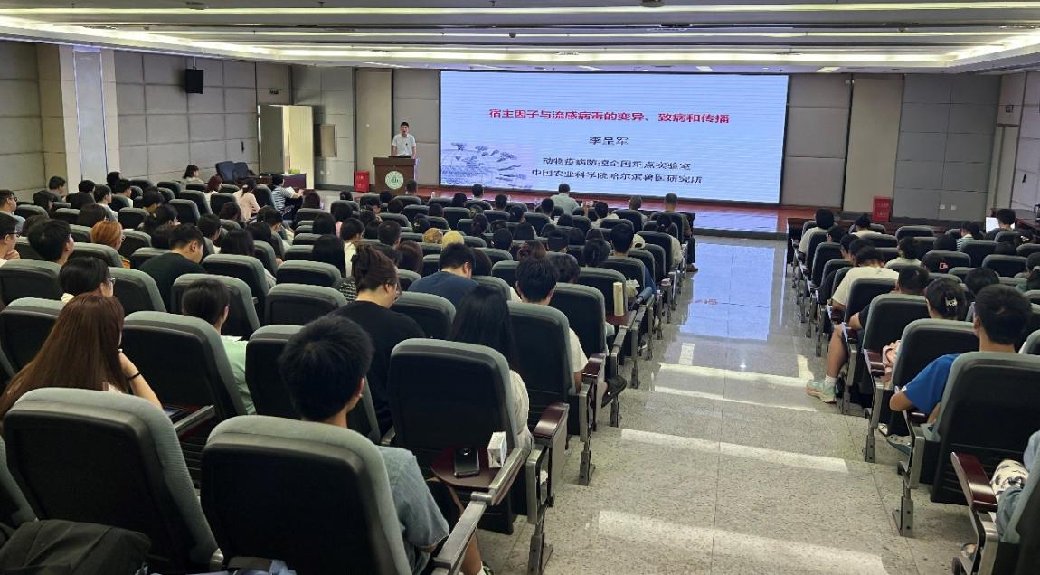 李呈军研究员以“宿主因子与流感病毒的变异、致病和传播”为主题,深入剖析了H7N9病毒在哺乳动物中致病力增强的分子机制,并探讨了泛素化、苏素化修饰对病毒复制、致病和传播的影响。他的报告不仅加深了师生们对流感病毒生命周期和致病机制的理解,还为大家提供了防控流感的新思路,激发了在场师生对流感研究的浓厚兴趣。