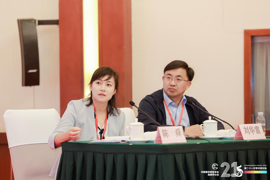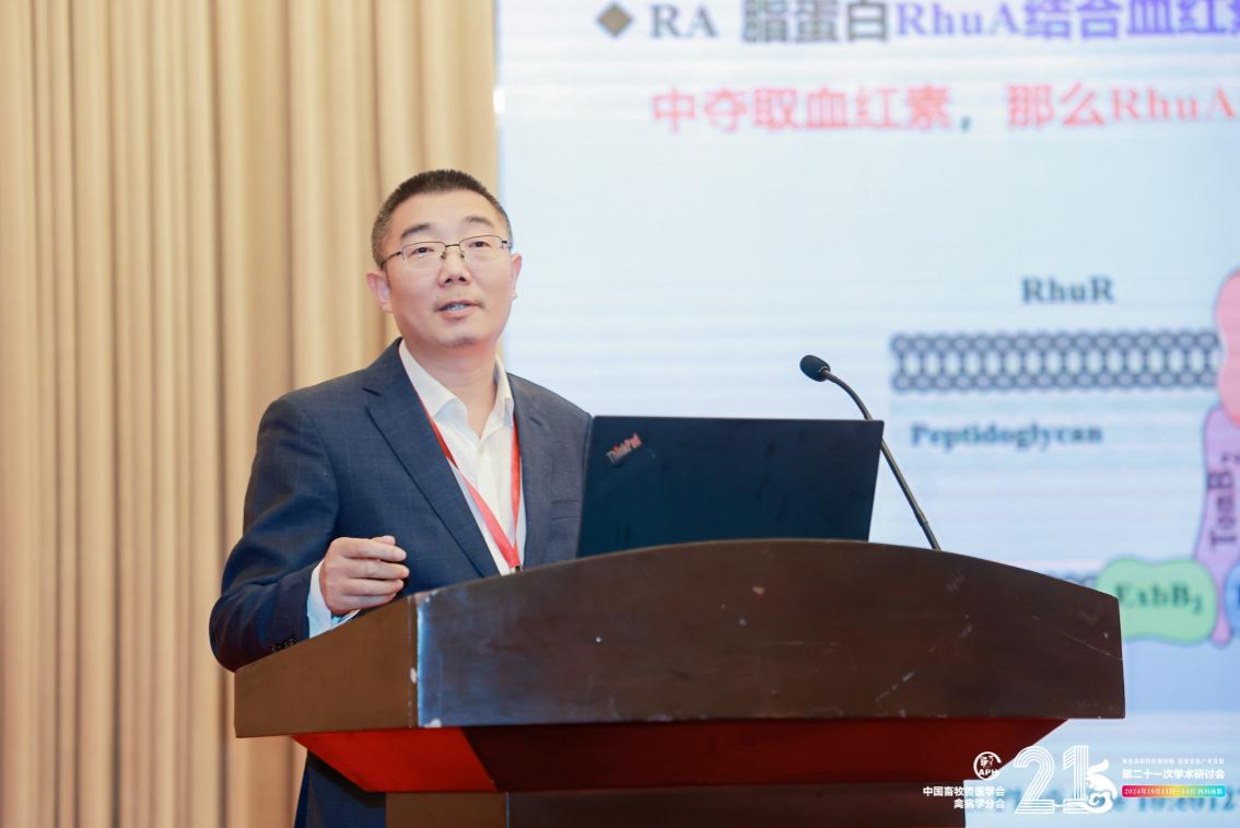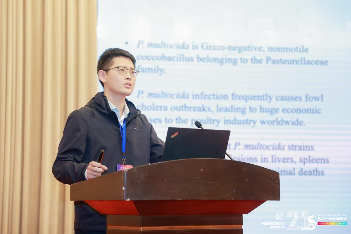 会议期间,动物医学免疫学研究所程安春教授作为特邀嘉宾,做了题为“鸭瘟新型疫苗研发实践和应用”的精彩报告。报告详细剖析了鸭瘟病毒的生物学特性、致病机制以及传统疫苗存在的局限性,并重点介绍了团队多年来在新型鸭瘟疫苗研发方面的重要进展。动物医学免疫学研究所教师刘马峰教授和赵新新副教授分别做了题为“一种新型血红素载体蛋白参与鸭疫里默氏杆菌血红素摄取的分子机制及结构基础”和“调控因子ArcA影响多杀巴氏杆菌毒力的机制”的专题报告,受到了与会者的热烈反响。