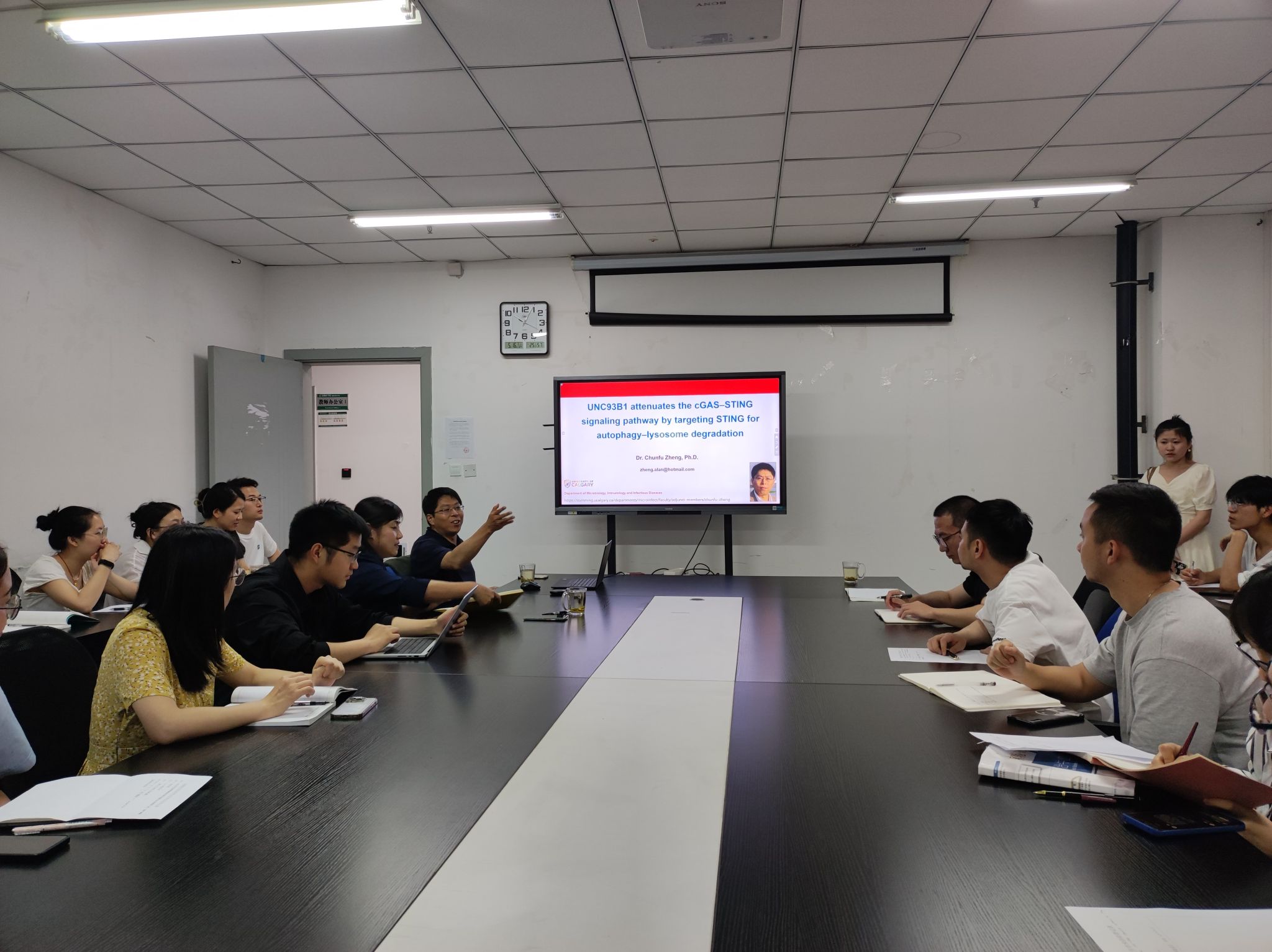 报告中,郑春福教授跟大家分享了发现UNC93B1蛋白背后的故事,详细讲述了UNC93B1通过自噬-溶酶体途径靶向降解STING的作用机制。郑教授团队通过UNC93B1基因敲除小鼠在体内证实了UNC93B1能够负向调控cGAS-STING信号通路,揭示了一种全新的抗病毒天然免疫应答机制。郑教授还在实验设计、论文写作和论文投稿等方面跟大家分享了宝贵的经验。报告后,陈舜副院长、部分教师代表和学生代表与郑教授积极互动,就感兴趣的问题进行了深入交流与探讨,现场氛围非常热烈。本次会议对师生科研思路的拓展以及学术氛围的营造起到了非常积极的作用。
