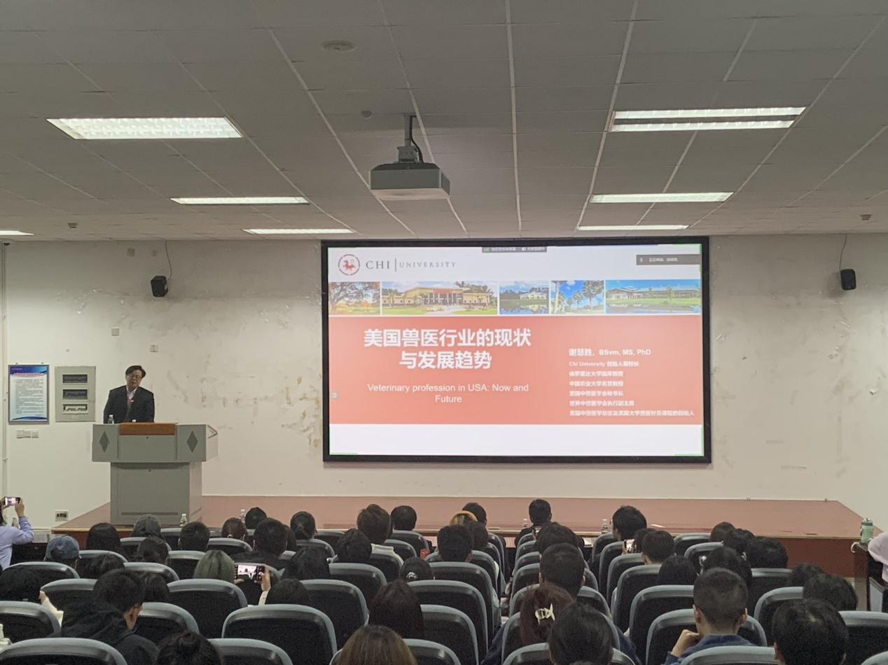 3月24日晚,享誉国际的中兽医专家、美国Chi University创始人兼校长、佛罗里达大学教学动物医院及兽医针灸诊室的创始人谢慧胜教授应邀在4教A102报告厅为师生作题为“美国兽医行业现状与发展趋势”的学术报告。报告由德赢VWIN官方网站副院长陈正礼教授主持,学院临床兽医系相关教师、研究生及本科生约400人线上线下同步聆听报告。